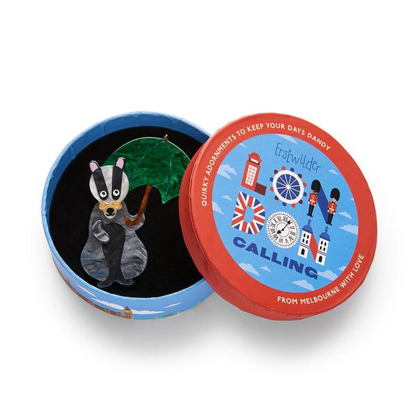 Bill the Badger is a rainy-day delight, always prepared for the London weather with his stylish green umbrella. Created for the 'London Calling' collection, this limited-run brooch has been hand-assembled from marbled black, grey and green resins and complete with etched and painted detailing.
