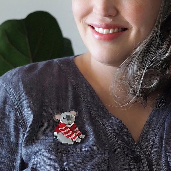 Ready to add extra comfort to your Christmas sweater, this koala brooch has been hand-assembled from a combination of textured resins and features hand-painted details.