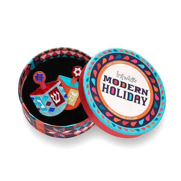 Inspired by the 'dreidels' or spinning tops, traditionally played with by children during the Jewish festival of Hanukkah, this brooch from the Modern Holiday collection has been hand-assembled from a mix of colourful textured and glitter resins with inset pieces and painted detailing. Happy Hanukkah to all those who observe it!