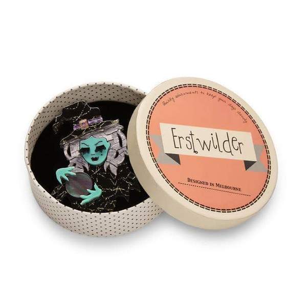 Not every witch lives in Salem. In fact, this particular witch can’t wait to come live with you. Pin her on and watch her best spell take effect, filling your outfits and your days with magic! Created from a combination of solid and textured resins, with hand-assembly and hand-painted details.