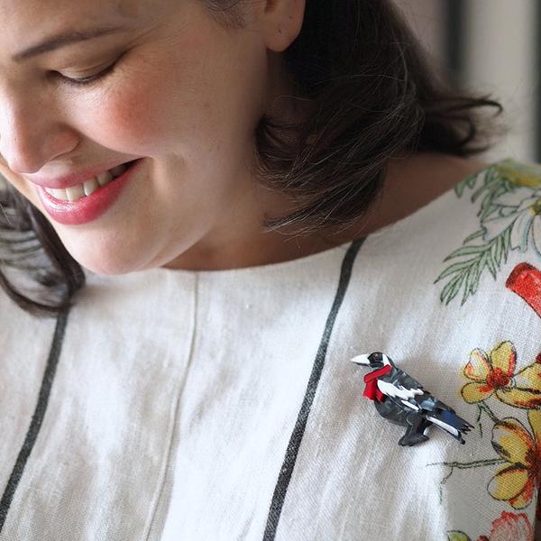 Brilliant black and white textured resins bring this Christmas magpie brooch to life. With hand-painted details and just a splash of colour, he'll add a little luck to your outfit.